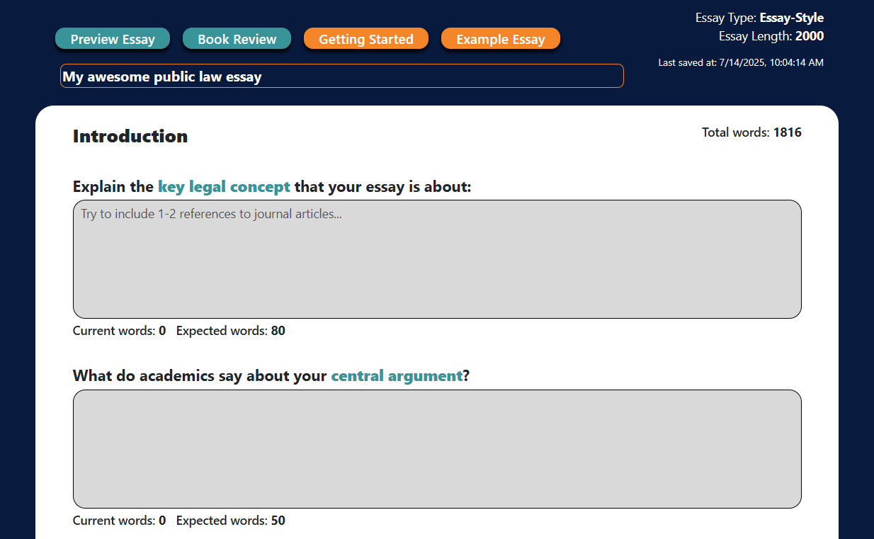 Select in the Law Essay Builder the expected word count of your assignment and confirm if you’re working on an essay-style or a problem-style coursework. If you’re working on a problem-style essay, then choose the number of legal issues in your problem scenario.